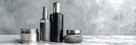 A stylish arrangement of mens skincare products on a marble counter, showcasing a modern aesthetic in muted tones for daily grooming.