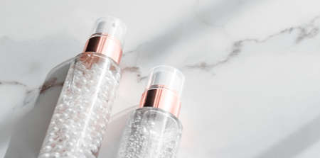 Cosmetic branding, packaging and make-up concept - Skin care serum and gel bottle, moisturizing lotion and lifting cream emulsion on marble, anti-age cosmetics for luxury beauty skincare brand design