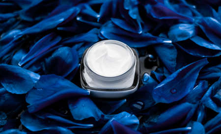 Cosmetic branding, moisturizing and anti-age - Luxury face cream moisturizer for facial skin on blue flower background, floral essense, spa cosmetics and beauty emulsion for skincare brand product