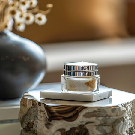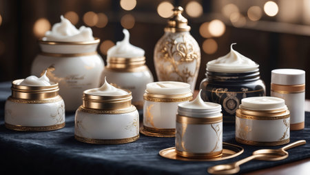 Elegant display of luxurious skincare jars arranged on a table with a soft, warm background highlighting their intricate designs