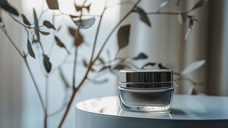 A mock up white jar of cream on a white gray background, on a white table with green leaves of a tropical plant, with hard shadows. Stylish look of the product, identity.
