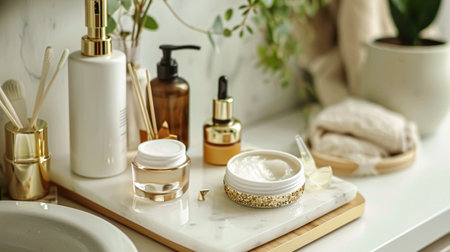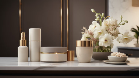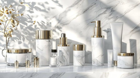 An AI generated illustration of A selection of Cosmetic products arranged on a polished white marble countertop