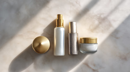 A stylish display of cosmetic bottles and jars capturing the essence of elegance on a marble surface, complemented by soft natural lighting and unique designs.
