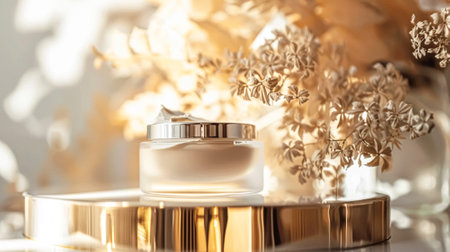 Face cream in a glass jar on a white and gold background. Skin care concept. Backdrop for beauty cosmetic products