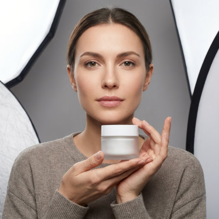 A serene woman with flawless skin holds a blank white cosmetic jar in a photo studio. Her direct gaze and professional lighting create a clean, modern beauty advertisement.