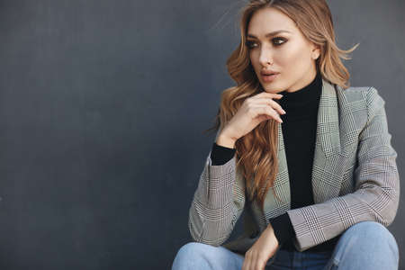 Two elegance fashion beautiful girls in stylish clothes sits on the street near a gray wall. Urban female style outfit
