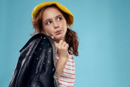Fashionable girl in a black leather jacket on a blue background and a yellow hat on her head