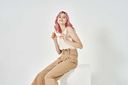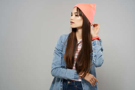 Teen style. Beautiful female model with long hair posing at studio in youth clothes. Red background. Beauty, fashion.