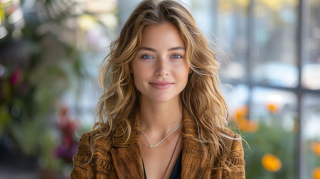 A close-up portrait of a young woman with curly hair, smiling softly, wearing a brown blazer, against a neutral background