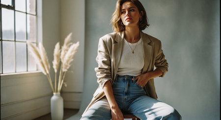 A young woman sitting on a stool in a stylish outfit, featuring a beige blazer and high-waisted jeans, with a soft background and natural light coming through a large window