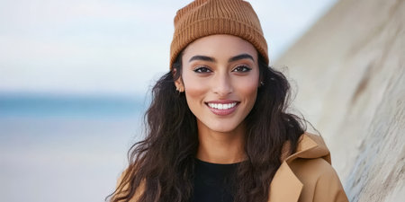 A woman stands confidently at the beach wearing a tan coat and a brown beanie. She smiles warmly showcasing a relaxed and joyful demeanor against a serene backdrop of sand and water.