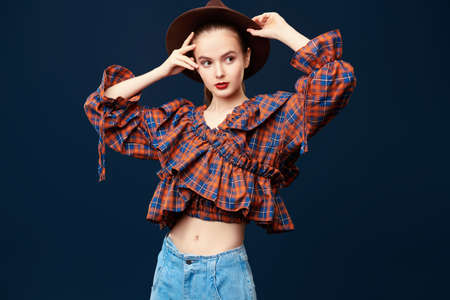 Fashion shot. Portrait of a cute girl model posing in jeans, checkered blouse and brown hat. Country, western style. New summer collection.