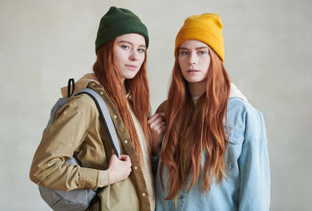 Medium studio portrait of two red-haired young Caucasian women wearing stylish casual clothes and backpacks looking at camera