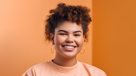 Portrait of a confident young woman wearing a trendy orange hoodie with a casual and fashionable pose against a soft gradient background.