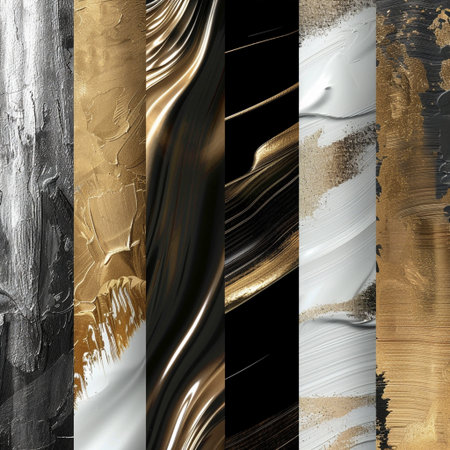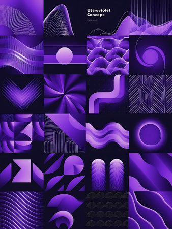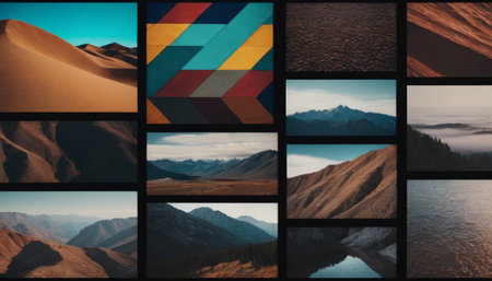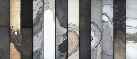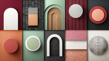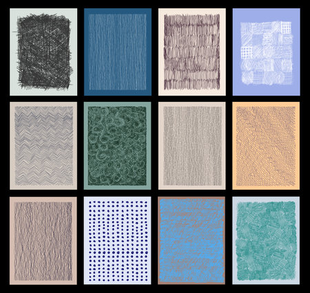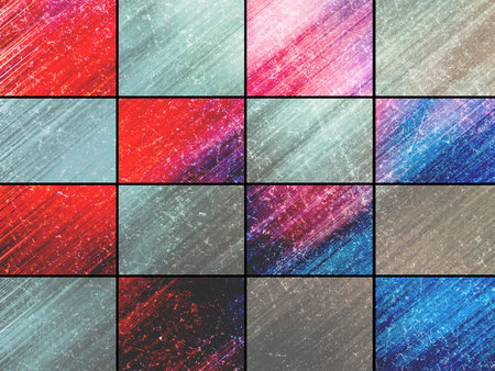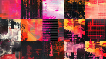 This visually striking abstract composition showcases a variety of shapes and textures in a balanced grid arrangement. Perfect for modern design themes.