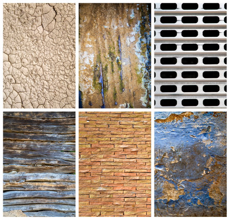 A six-panel collage diverse textures: light wood grain, peeling brick, coarse burlap, speckled concrete, and...