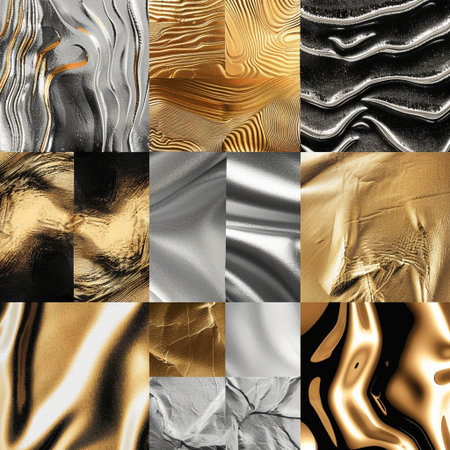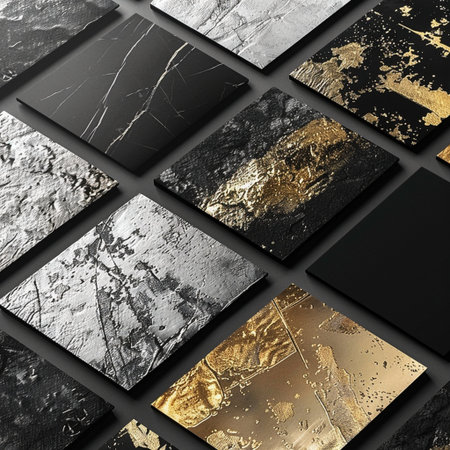 A luxury background showing samples of premium finishing materials, including marble, gold, and glittering stones.