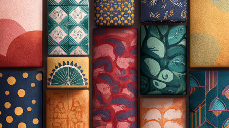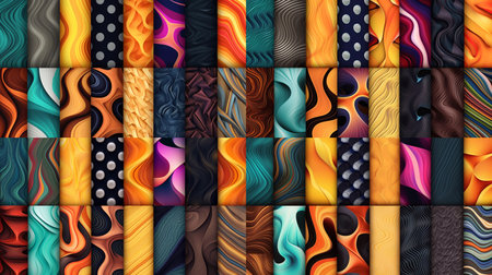 Vibrant textile patterns with abstract designs and floral motifs, arranged in a captivating layout, highlighting artistic creativity and colorful aesthetics, AI generated