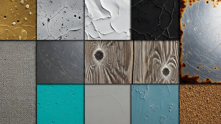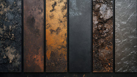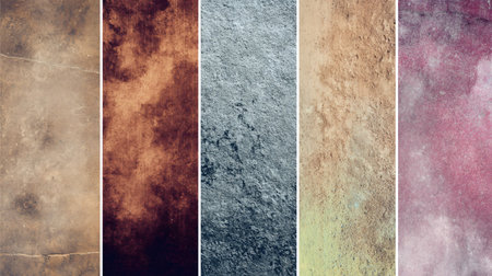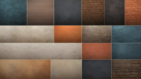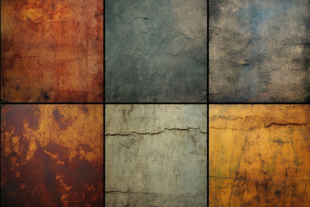 A collection of textured wall panels showcasing a variety of surfaces, colors, and weathering effects, perfect for backgrounds in art and design projects.