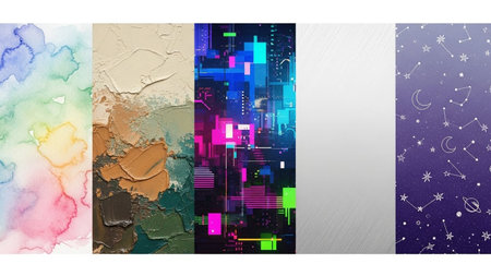 Paint showing collage of five vertical abstract backgrounds watercolor paint texture digital and constellations....