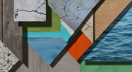 A creative abstract collage features a geometric arrangement of various textures, including weathered concrete, wood grain, rippling water, woven fabric, and painted surfaces. The composition contrasts natural and man-made materials with sharp angles and vibrant colors, creating a unique design background.