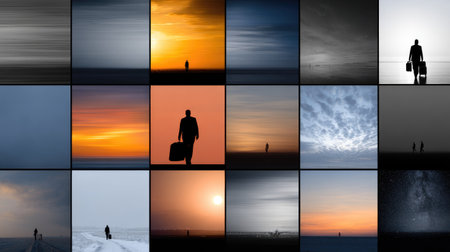 This artistic collage showcases diverse silhouettes of solitary figures set against stunning skies at various times of day, evoking deep emotions.