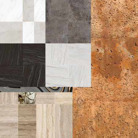 A collage showcasing a variety of textures including cracked concrete, aged copper, burlap weave, and marble patterns.