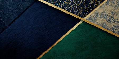 A luxurious abstract background with three colors--rich emerald green, deep navy blue, and gold. The elegant tones form an intricate pattern, creating a sophisticated atmosphere ideal for luxury branding or fine art projects.