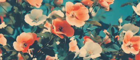 Beautiful fairy dreamy magic yellow red pink flowers with dark green leaves stems on field outside