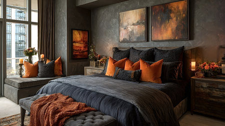 Large comfortable bed with many pillows in a modern bedroom with dark concrete walls and orange accents creating a cozy and sophisticated atmosphere