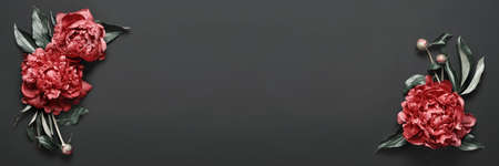 Beautiful red peonies frame on black banner. Dark Spring or summer floral background. Festive flowers concept