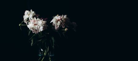 Beautiful delicate peonies on a dark background, blooming flowers, March 8, mother's day, birthday present.