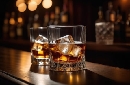 Two glasses of amber whiskey are placed on a dark bar counter, filled with large ice cubes. The background is softly lit, creating a warm and inviting atmosphere for relaxation..