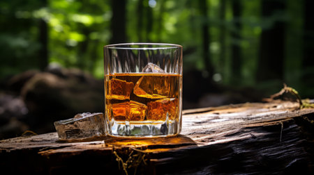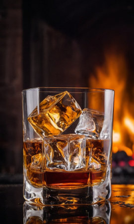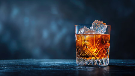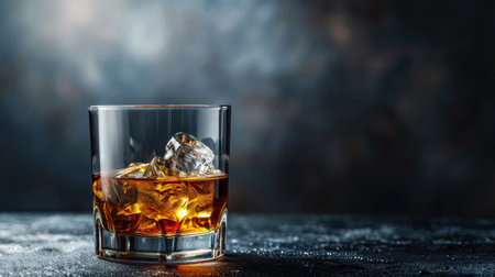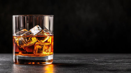 A captivating image of a glass filled with whiskey and ice cubes, showcasing the rich amber color against a dark background, perfect for themes of relaxation and sophistication.