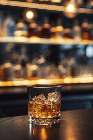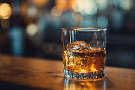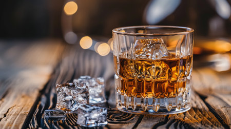 A close-up shot of a glass of whiskey with ice cubes, set against a blurred background of warm, glowing bokeh lights, creating a sophisticated and inviting atmosphere.