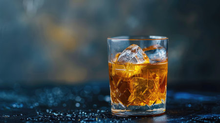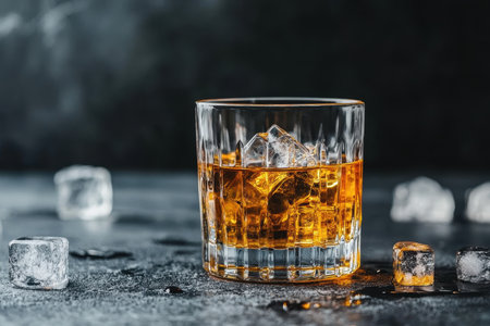 A glass filled with whiskey sits on a textured dark surface, surrounded by scattered ice cubes. The amber liquid glistens as light reflects off the glass, creating an inviting atmosphere.