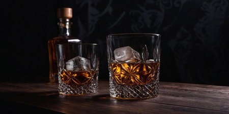 Two glasses of whiskey with ice on a wooden table on a dark background