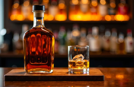 whiskey bottle and glass on wooden table in bar, shallow focus