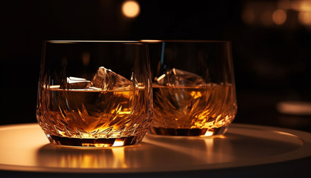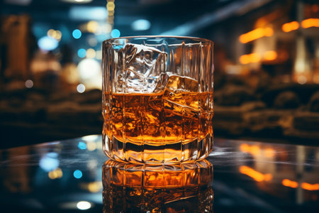 Luxury whiskey cocktail on bar table with ice and reflection generated by artificial intelligence