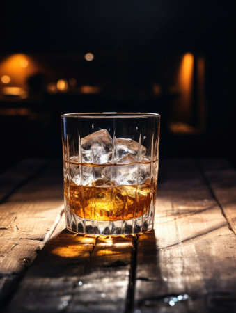 A glass filled with amber whiskey rests on top of a wooden table, reflecting the warm ambient light in the room.