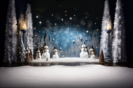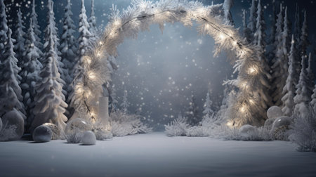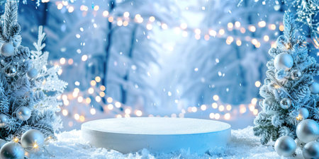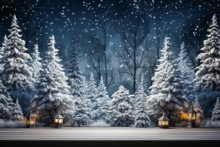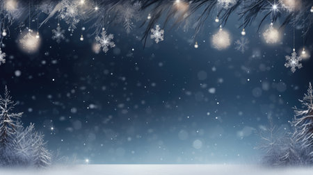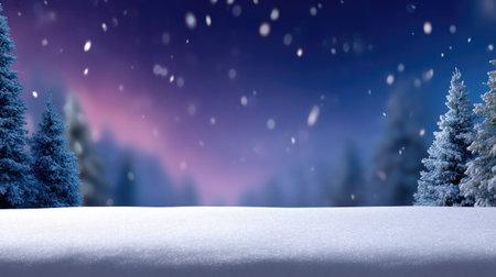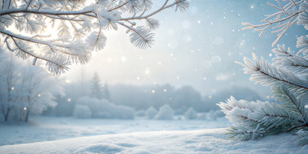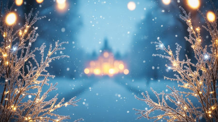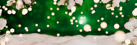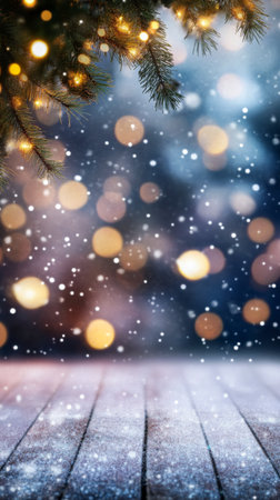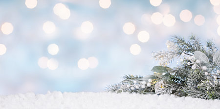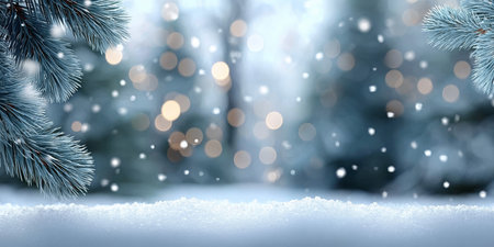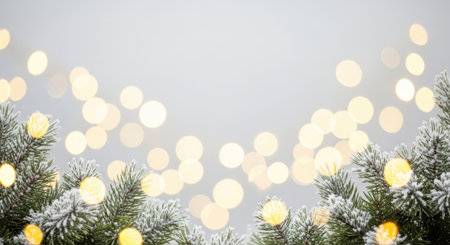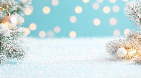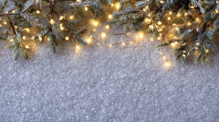 Captivating winter holiday background featuring pine branches adorned with glowing lights, resting on a soft snowy surface, ideal for festive themes and celebrations.