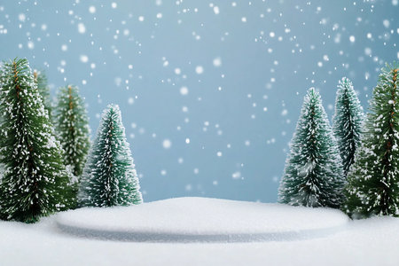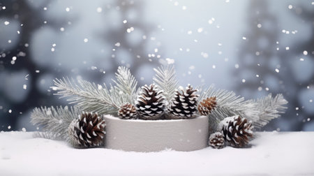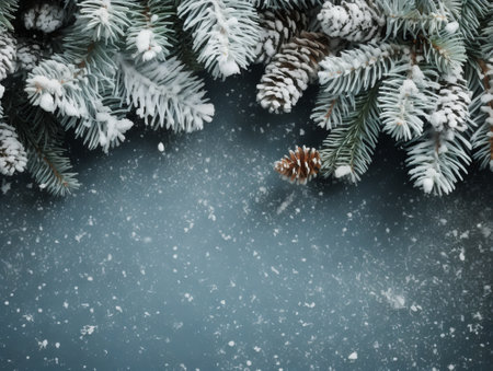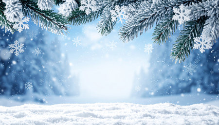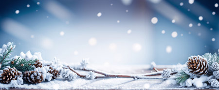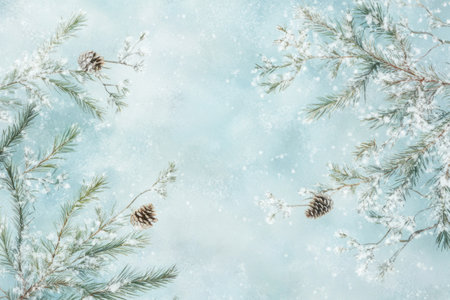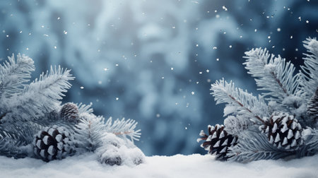 A serene winter scene featuring snow-covered spruce branches and pine cones on a frosty surface, set against a dreamy blue background with gentle snowfall. Perfect for seasonal themes.