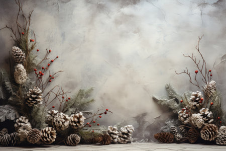 A decorative arrangement features pinecones, snowflakes, and frosted greenery against a dark background, creating a festive atmosphere ideal for winter celebrations.