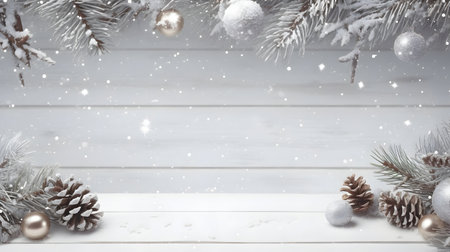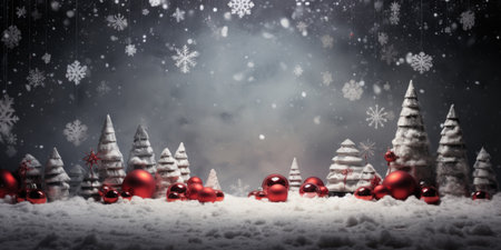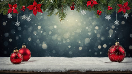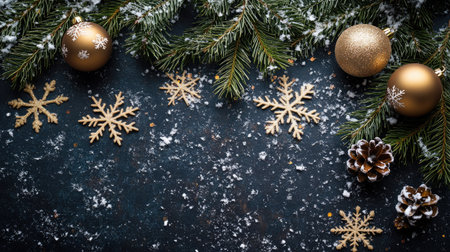 Festive background featuring snowflakes, Christmas baubles, and pine branches on a dark surface, perfect for holiday greetings