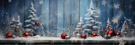 Generative AI : Winter colorful christmas scenic blue background with copy space Wooden flooring was strewn with snow in forest and spruce branches covered with snow on nature outd