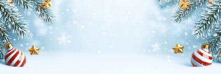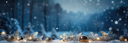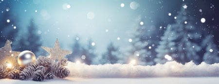 Christmas decoration on snow background with bokeh effect. Banner.