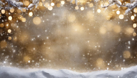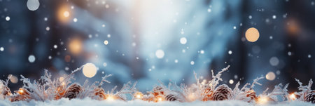 Blurred winter and Christmas background with snowy pine branches and abstract golden lights in a festive holiday scene. Horizontal banner with winter design and space for text.