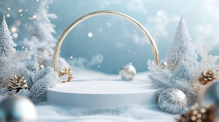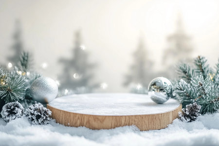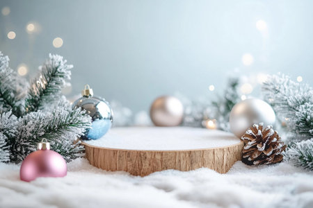 Winter Christmas composition with geometric shapes podiums and christmas decorations in snow. Empty pedestal for product presentation and for advertising display