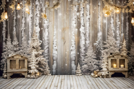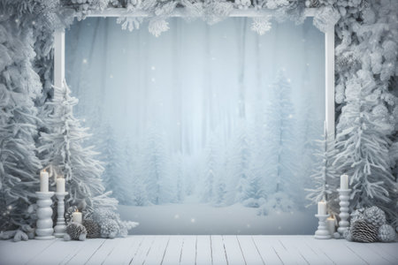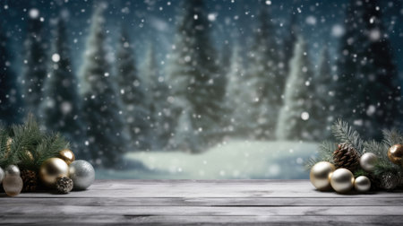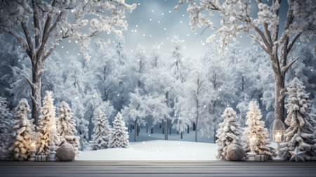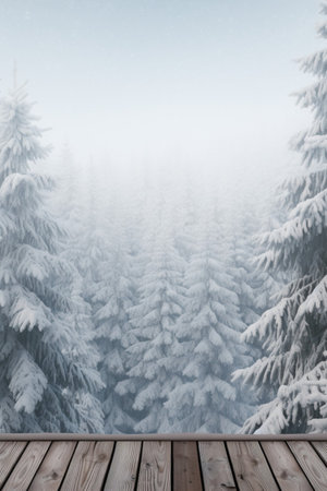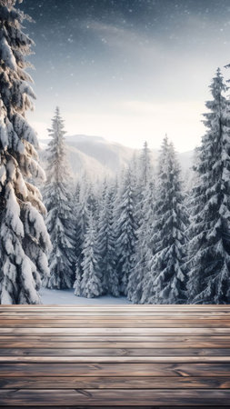 Generative AI : Winter christmas scenic landscape with copy space Wooden flooring strewn with snow in forest with firtrees covered with snow on nature