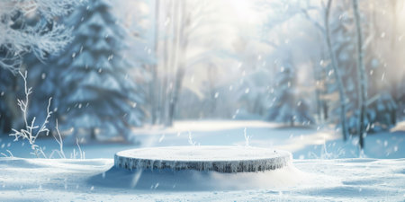 A frozen platform set against a snowy winter landscape, featuring frosted trees and a serene, cold atmosphere. High quality photo